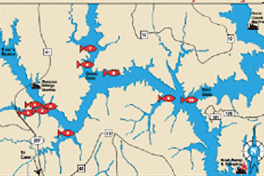 Spotted bass are found throughout the main basin, on long tapering points, at creek mouths, and around offshore brush piles placed by anglers. Deep timbered areas and main-lake humps are also consistent producers, especially during summer and winter.